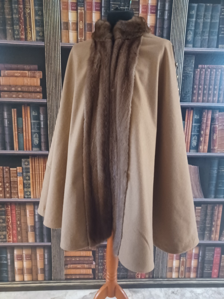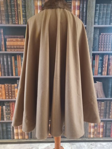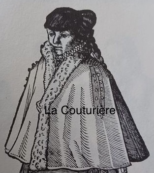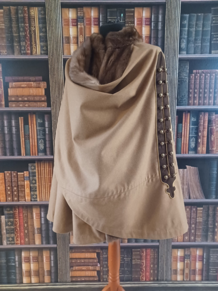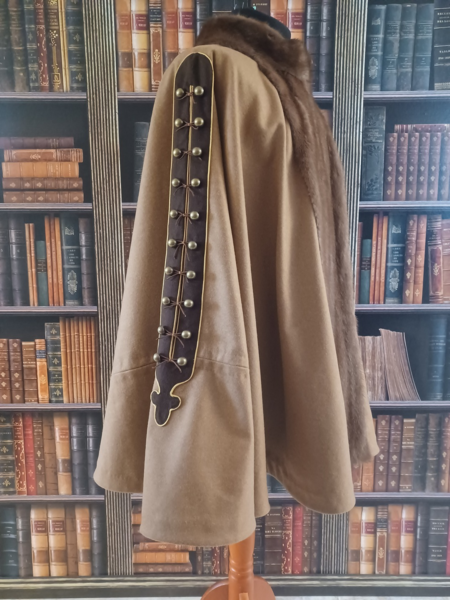 Ein Kupferstich aus dem 16. Jahrhundert war die Anregung für diesen kurze Radmantel. Das Material ist Schurwolle mit einem kleinen Anteil Kaschmir (20%). Die Armschlitze sind mit einer braunen Blende, insgesamt 40 Metallknöpfen und Nestelschnüren verziert und können damit geschlossen werden. Der Besatz vorn und an dem Kragen ist aus Nerzfell gearbeitet, und Upcycling von einem ausgedienten Mantel. Geschlossen wird er mit Haken und Öse.