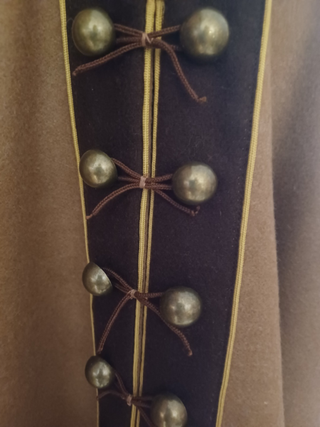 Vorlage für diesen Mantel war ein Original aus dem Germanischen Nationalmuseum. Diese Ausführung ist aus schwerem norwegischen Wolltuch, mit 131 Knöpfen und natürlich auch den dazugehörigen Knopflöchern (Maschine) , verziert mit rotem Keder und innen mit Leinen/Baumwollmaterial abgefüttert.