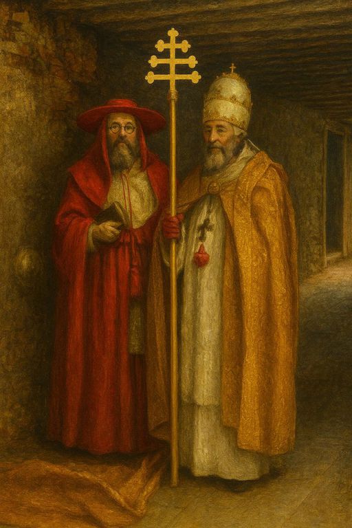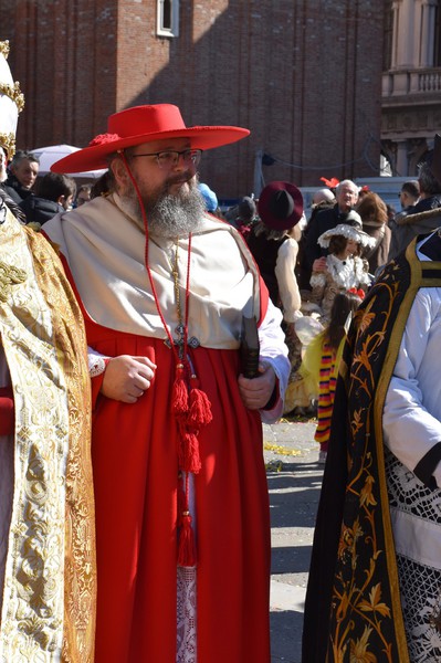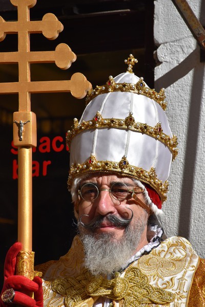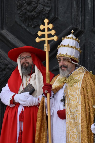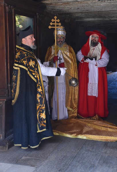 Highlight war die Tiara mit Samthaube für Wolfgang, dessen dazu passendes Gewand von Ramon genäht wurde. Ramon trug das spanische Birett aus unserer Werkstatt. Vollständig und neu eingekleidet wurde Frank als Kardinal, die Vorlage gaben bildliche Nachweise von Ende 15./ Anfang 16. Jhd.