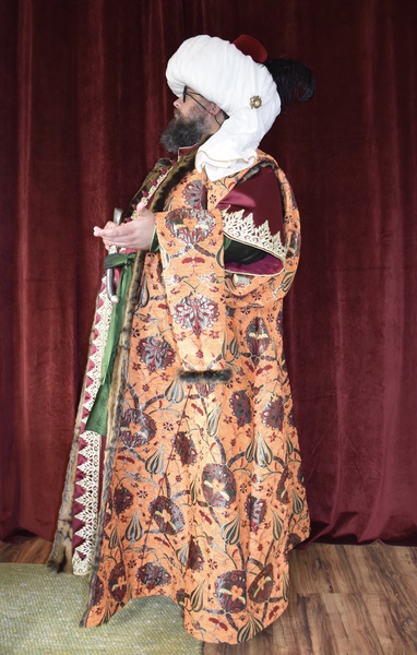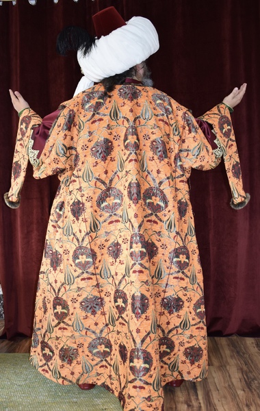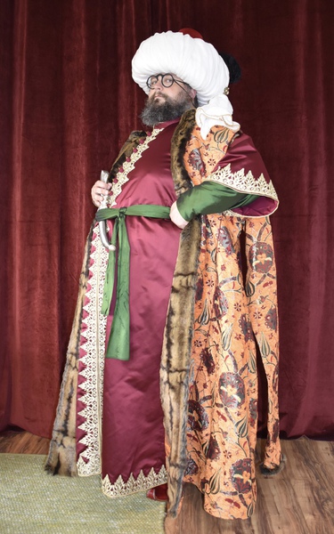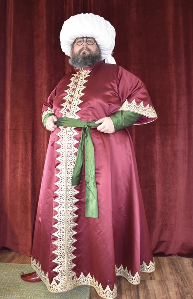 Weinrote Duchesse-Seide und ein aus der Türkei kommender Stoff mit den typischen osmanischen Motiven (z.B. stilisierte Tulpe), sowie eine Fellverbrämung, hier allerdings kein Echtpelz, sondern einer hervorragenden Nachbildung und eine goldene Borte bringen dieses Gewand zur Wirkung.