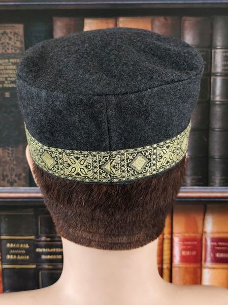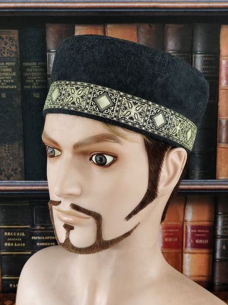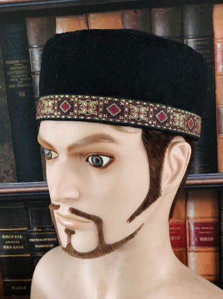 Eine Toque aus Samt, reich verziert und innen mit roter Seide ausgefüttert, rundet das Outfit ab.
